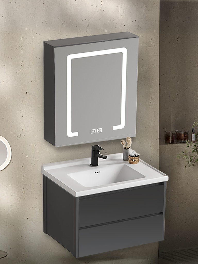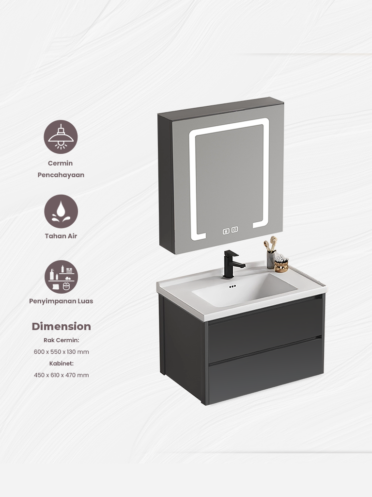 Tingkatkan estetika dan kenyamanan kamar mandi Anda dengan HARUMA Life 602L-DARK GREY, set kabinet dan wastafel bergaya modern dengan fitur cermin pintar yang dilengkapi pencahayaan. Ideal untuk ruang minimalis dan bergaya kontemporer.